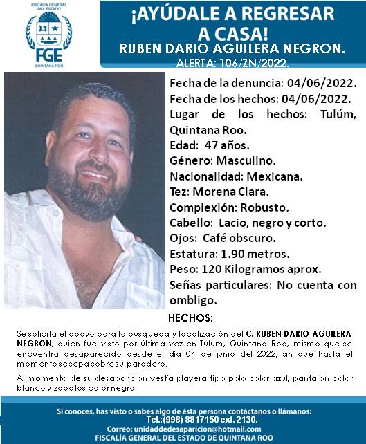 Cabe recordar que Rubén Darío Aguilera Negrón de 47 años de edad, fue reportado como desaparecido por sus familiares el pasado 4 de junio en Tulum.