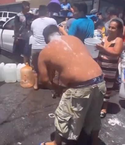 Un hombre fue captado dándose un baño exprés, con ayuda de una mujer que le daba cubetazos para quitarle el jabón y el shampoo del cuerpo