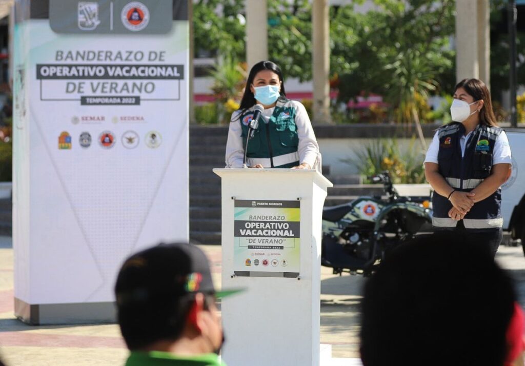 Puerto Morelos, Quintana Roo, 22 de julio de 2022 – La presidenta municipal Blanca Merari Tziu Muñoz dio hoy el banderazo de inicio del Operativo Vacacional de Verano, temporada 2022, en el que participan instancias de los tres órdenes de gobierno con el objetivo de garantizar la seguridad de los turistas y los habitantes de Puerto Morelos.