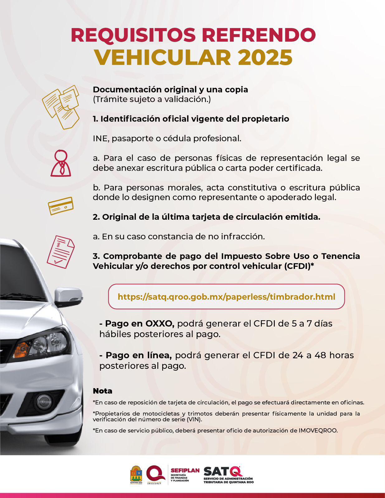 El trámite puede realizarse en las Direcciones de Recaudación y Módulos de Emplacamiento de los 11 municipios de Quintana Roo en un horario de 8:00 a.m. a 3:30 p.m. También puede generarse el pago en línea a través del sitio oficial https://satq.qroo.gob.mx/controlvehicular/, así como en bancos, tiendas OXXO, por transferencia SPEI o directamente en ventanillas de las oficinas.