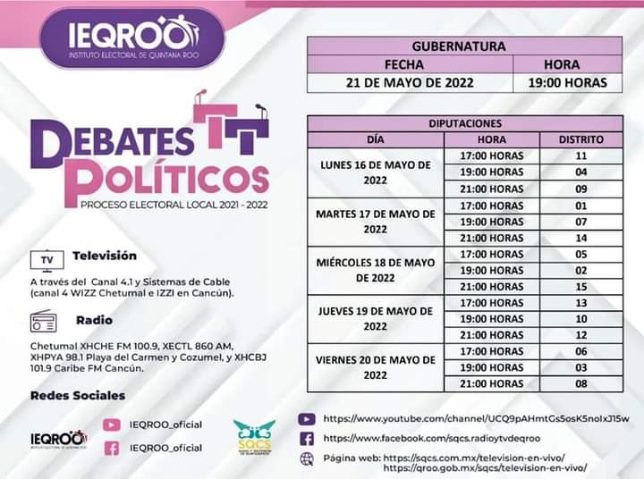 Para este martes 17 se tienen programados los debates del Distrito 1, 7 y 14 de Quintana Roo, a las 5, 7 y 9 de la noche, respectivamente.