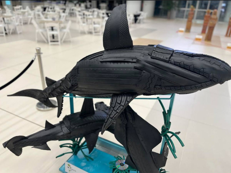 Se trata de una escultura muy especial donde es posible ver a detalle la silueta de un tiburón gris de arrecife, un tiburón martillo y un pez guitarra, del joven artista panameño Romel Bravo, quien recibió el apoyo del Fondo Internacional para el Bienestar Animal (IFAW, por sus siglas en inglés), para poder dar a conocer sus creaciones al mundo.
