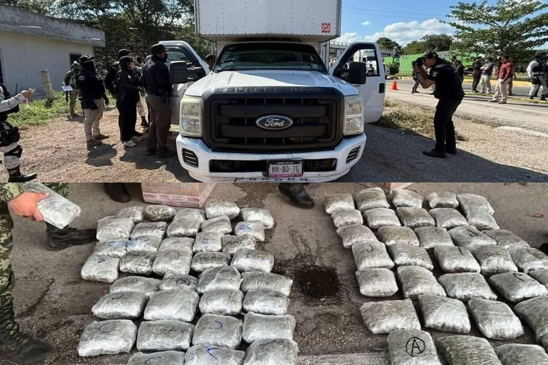 De acuerdo con el reporte oficial, el vehículo, una unidad de paquetería con destino a Quintana Roo, fue detenido para una inspección preventiva. Durante la revisión, un binomio canino de la Unidad K-9 realizó una marcación positiva, lo que llevó a los agentes a inspeccionar el área señalada.
