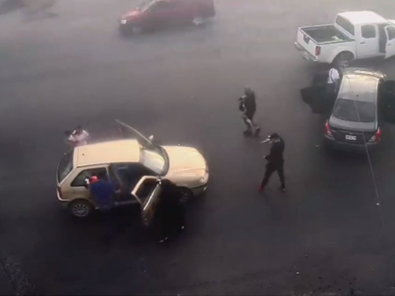 Un video captado por cámaras de seguridad, permite ver como hombres armados le cierran el paso a automovilistas con un auto tipo sedán y tras descender amagan a los pasajeros del coche más cercano.