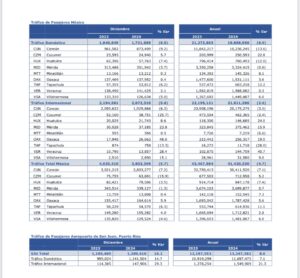 Cancún (Marcrix Noticias)-ASUR, grupo líder en operación de aeropuertos con presencia en México, Estados Unidos y Colombia, anunció que en diciembre de 2024 el tráfico total de pasajeros alcanzó los 6.7 millones, marcando un incremento del 2.3% en comparación con diciembre de 2023.
