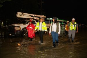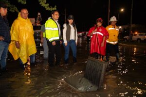 Acompañada por los titulares de las secretarías de Protección Civil, Prevención de Riesgos y Bomberos y, de Servicios Públicos, Darwin Covarrubias y Julieta Martín, respectivamente, supervisó las labores de las cuadrillas de trabajadores municipales desplegados para desaguar calles y avenidas.