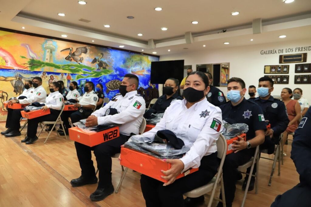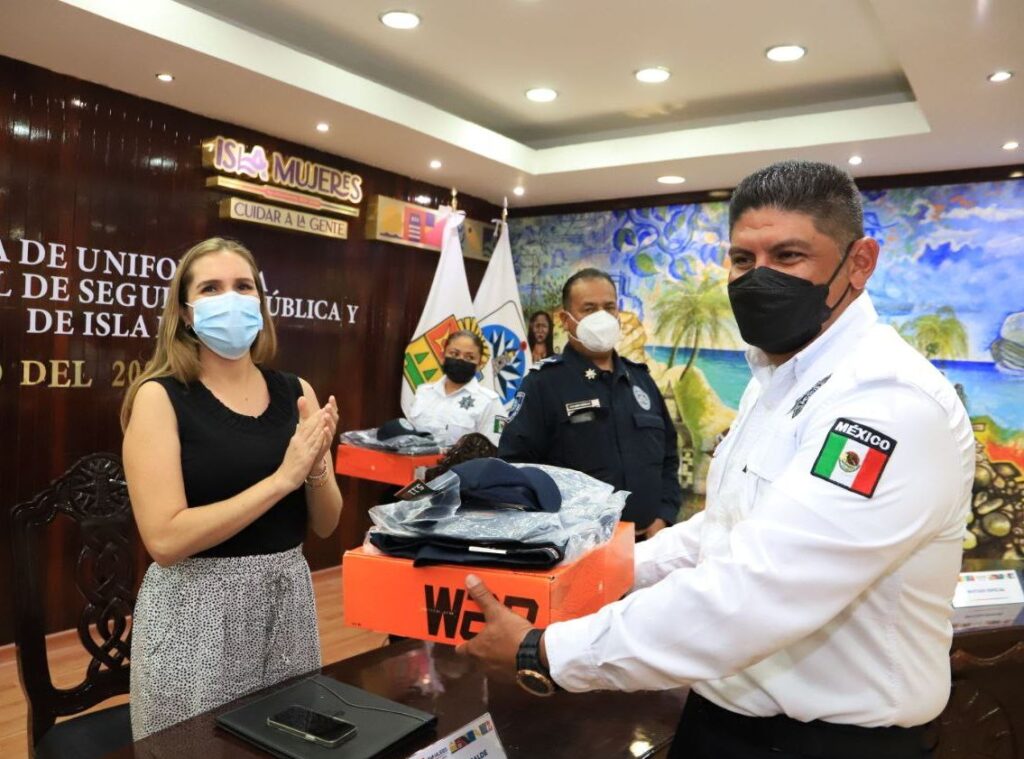 Isla Mujeres, Quintana Roo, 29 de Julio del 2022.-Con la finalidad de mejorar y dignificar las condiciones laborales de quienes brindan seguridad a las familias isleñas, la presidente municipal, Atenea Gómez Ricalde, entregó uniformes nuevos a los elementos de la Dirección General de Seguridad Pública y Tránsito Municipal.