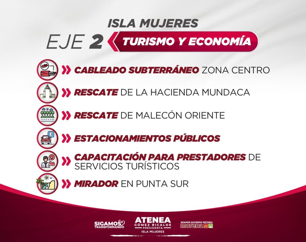 Respecto al eje 2 de turismo y economía, en la Zona Insular, mencionó que entre las propuestas está la obra de cableado subterráneo en el Centro, además del rescate de la Hacienda Mundaca, el Malecón Oriente y el mirador de Punta Sur, así como también la construcción de un estacionamiento público y más capacitación para los prestadores de servicios turísticos.