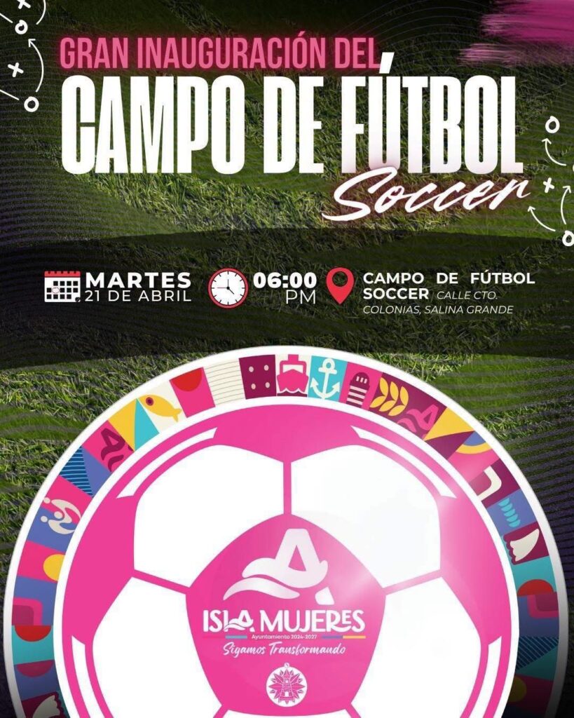 Isla Mujeres (Marcrix Noticias).– La Presidenta Municipal, Atenea Gómez Ricalde, anunció durante su rueda de prensa de este lunes que este martes 21 de abril se llevará a cabo la inauguración de la nueva cancha de fútbol soccer en la colonia Salinas, como parte de las acciones para fortalecer el deporte y el bienestar de las familias isleñas.
