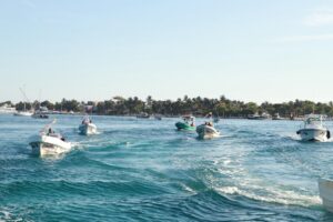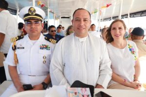 Embarcaciones partieron desde el Muelle Fiscal de Madera acompañadas de autoridades, familias y la comunidad náutica, quienes navegaron juntos hasta llegar al sitio donde se encuentra la Cruz de la Bahía. Ahí se celebró una misa oficiada por el párroco de Isla Mujeres, Rafael González Guzmán, en honor a las y los hombres de mar que han perdido la vida, y posteriormente se depositó la ofrenda floral en señal de respeto y recuerdo.