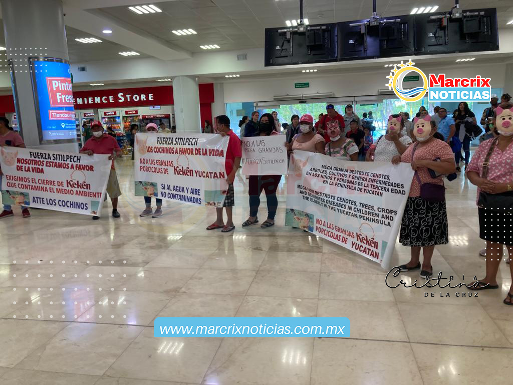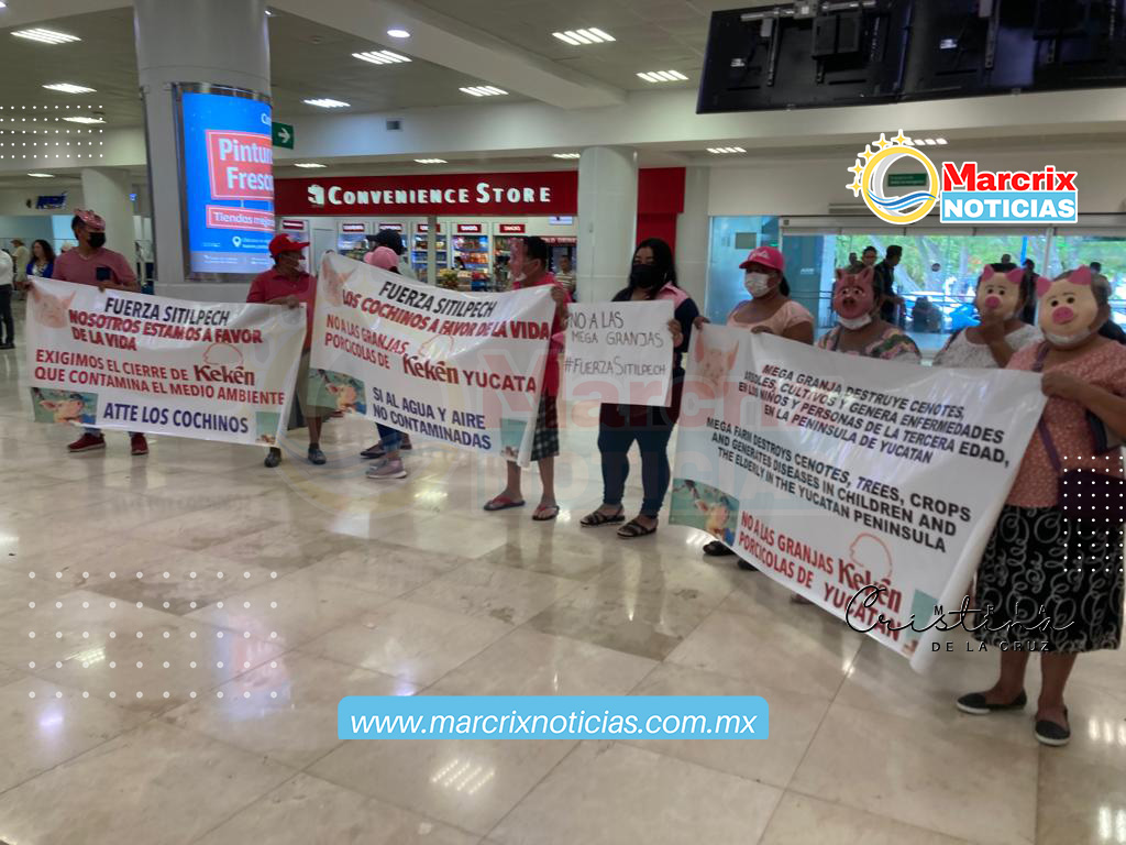 Cancún (Marcrix Noticias).- Con pancartas, mantas y máscaras de cerdos, un grupo de personas en su mayoría mujeres de Sitilpech, municipio de Izamal, llegaron hasta el aeropuerto de Cancún para protestar contra la granja porcícola Kekén.
