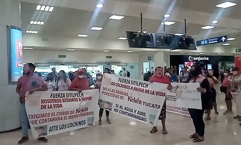 Pobladores de la comunidad de Sitilpech, municipio de Izamal, llegaron hasta la terminal aérea número dos para señalar los estragos de contaminación que está provocando la granja