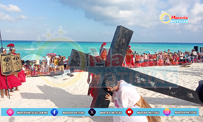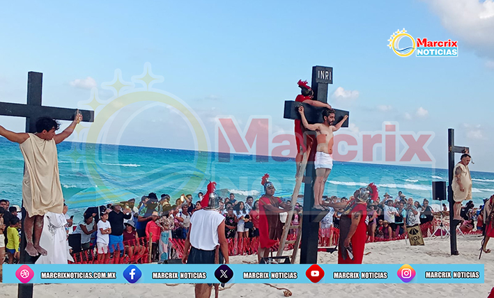 Cancún (Marcrix Noticias).- Después de que fue traicionado por 30 monedas de plata, murió en la cruz el Jesús de Vía Crucis en la Playa, Rafael Pérez Pasquel, quien sufrió la negación de Pedro, 30 latigazos, golpes y burlas solo por llamarse hijo de Dios.