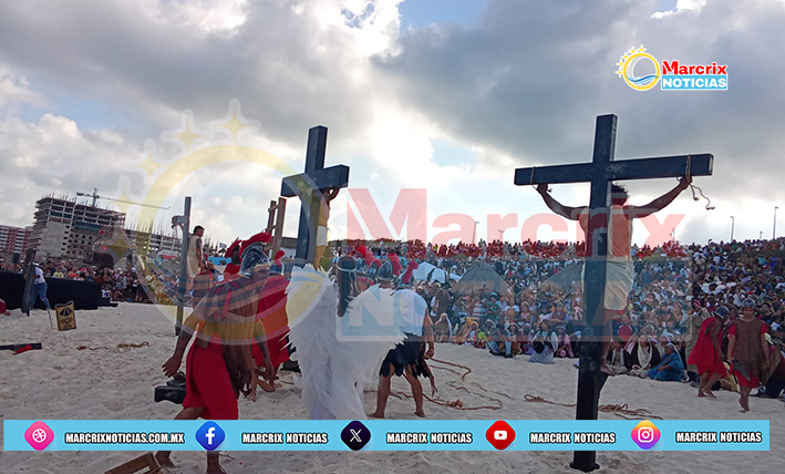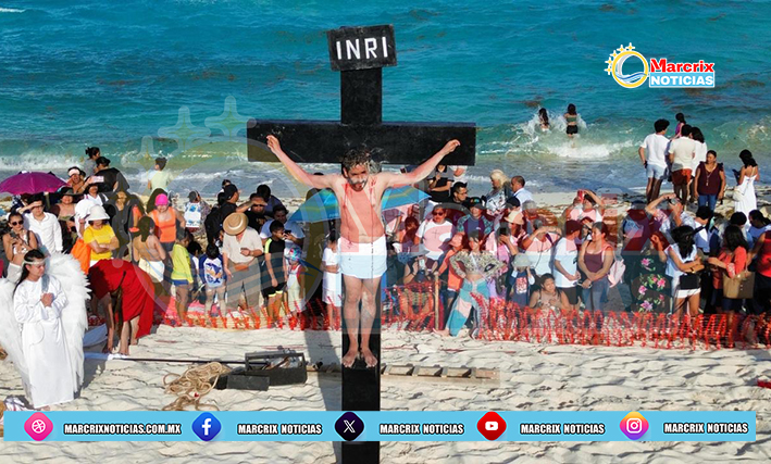 Cancún (Marcrix Noticias).- Después de que fue traicionado por 30 monedas de plata, murió en la cruz el Jesús de Vía Crucis en la Playa, Rafael Pérez Pasquel, quien sufrió la negación de Pedro, 30 latigazos, golpes y burlas solo por llamarse hijo de Dios.