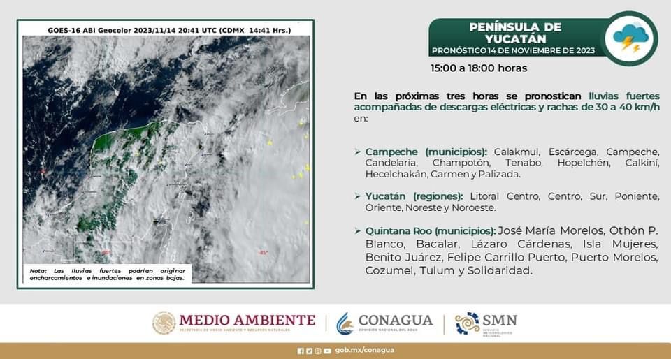 La Conagua Comisión Nacional del Agua-SMNmx informa que para las próximas horas se pronostican lluvias fuertes acompañadas de descargas eléctricas y rachas de viento de 30 a 40 km/h para todos los municipios de Quintana Roo.