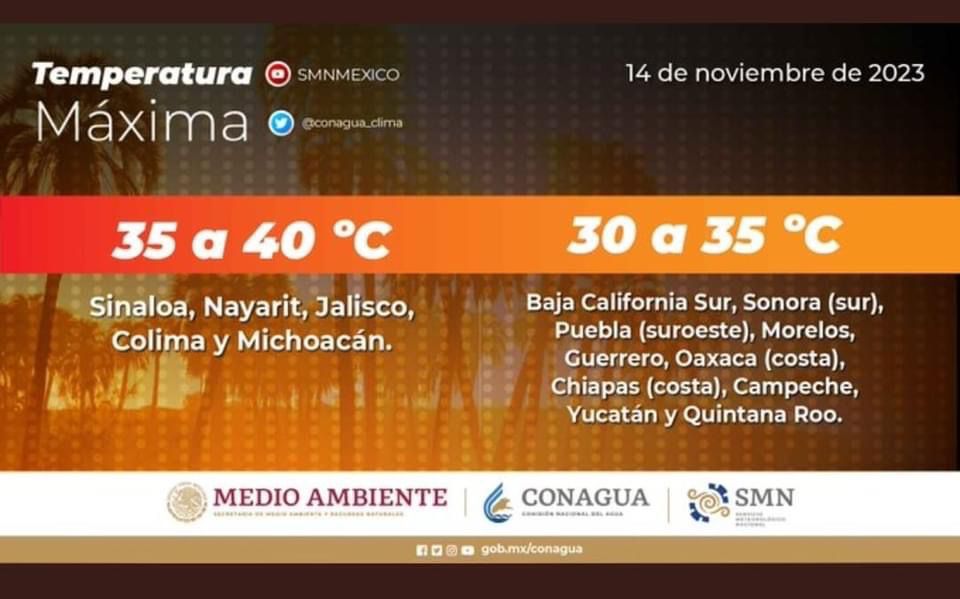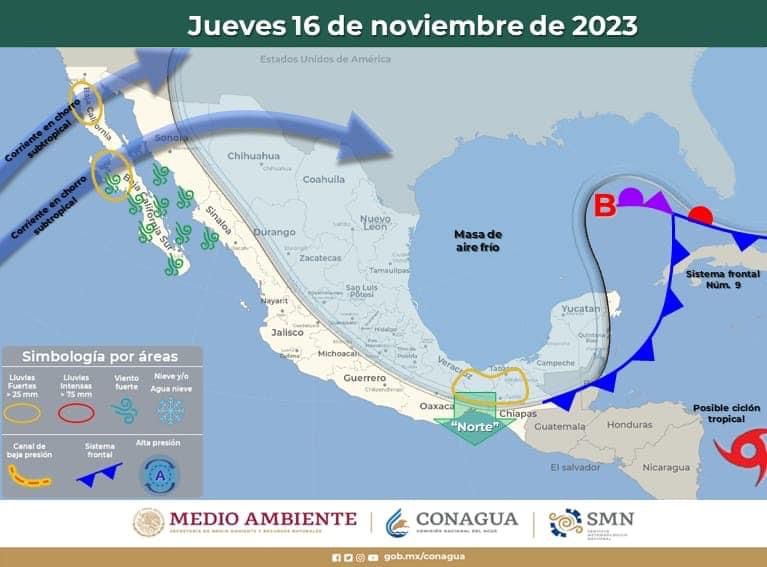 La masa de aire que impulsa al frente originará un débil evento de norte principalmente sobre las zonas costeras del norte y a lo largo de las costas del estado con vientos del norte y noroeste de 30 a 40 km/h y rachas más fuertes durante los días jueves y viernes, perdiendo intensidad durante la tarde del sábado, así mismo se espera un ligero descenso de las temperaturas tanto máximas como mínimas principalmente en las zonas rurales del estado mismas que podrán estar rondando los 18 a 20 grados de temperatura como mínima principalmente por la noche, madrugada y primeras horas de los días, viernes, sábado y domingo; pudiéndose percibir sensaciones térmicas menores.