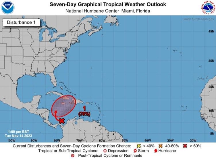 (Marcrix Noticias).- Datos del el Centro Nacional de Huracanes de Miami, Florida, indican que la zona de baja presión al suroeste del Mar Caribe, incrementó a 20 por ciento de probabilidad para desarrollo ciclónico en 48 horas y mantiene 70 por ciento en 7 días.