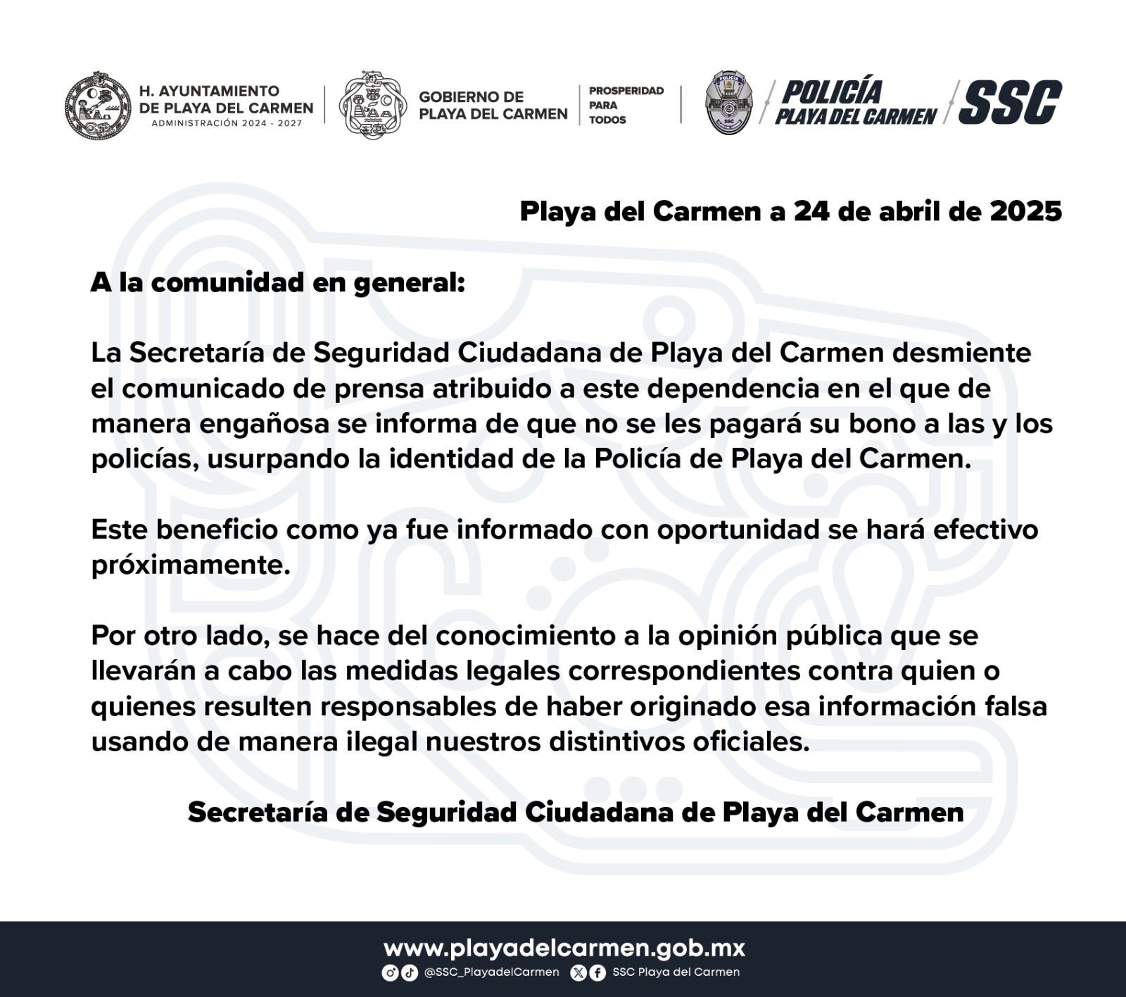 Desmienten comunicado falso sobre el bono policial en Playa del Carmen