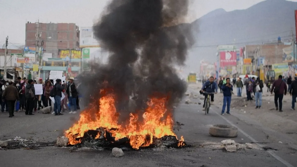 Con piedras, palos quemados y neumáticos en llamas cientos de manifestantes bloquean la pista de aterrizaje del aeropuerto de Arequipa, segunda ciudad de Perú, para pedir la renuncia de la…