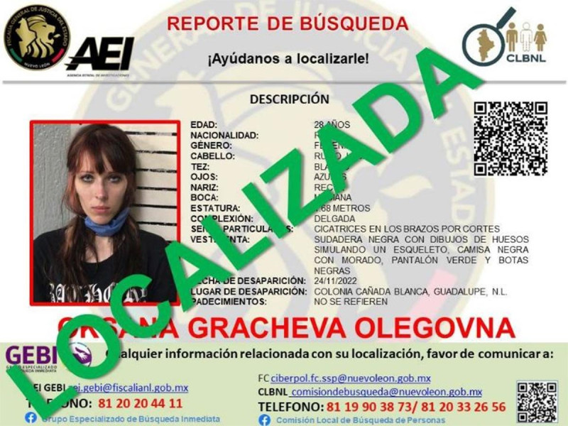Orsana Gracheva Olegovna, se hallaba desaparecida desde el pasado 24 de noviembre cuando fue vista por última ocasión en la colonia Cañada Blanca, en Guadalupe Nuevo León (Marcrix Noticias).- Viva…
