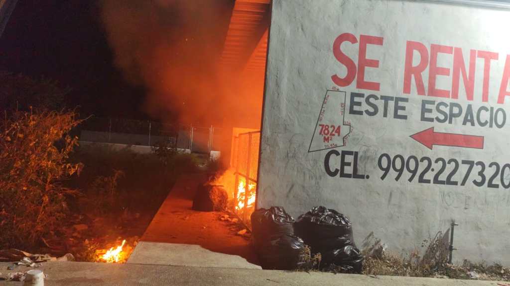 Niños queman contenedor de basura al jugar con pirotecnia en Plaza Comercial de Yucatán