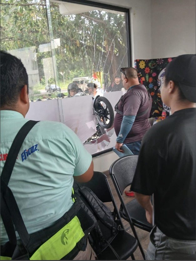 Incrusta su motocicleta en el cristal de oficinas de Movilidad en Cancún