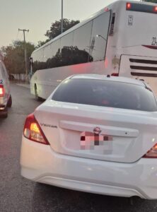 El conductor del Versa, al no considerar las condiciones de la vía, perdió el control del vehículo y se estrelló directamente contra la parte trasera del autobús, quedando ambos vehículos detenidos en el lugar.