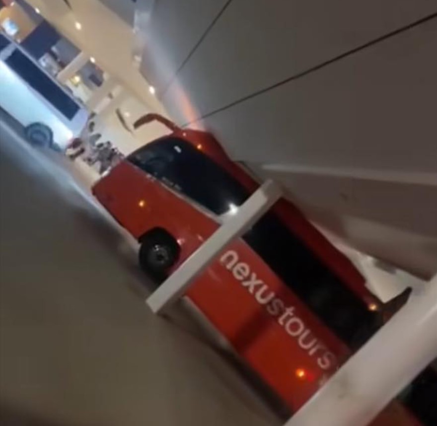 Cancún (Marcrix Noticias).- Un autobús de color rojo, perteneciente a Nexustours de la empresa Del Valle, quedó atorado la noche de este lunes, en la Terminal 4 del Aeropuerto Internacional de Cancún, provocando tráfico e incomodidad entre los usuarios que llegaban o salían del lugar.
