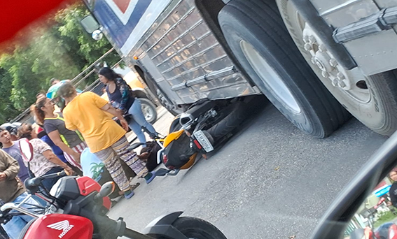 A bordo de la motocicleta iba una mujer, la cual resultó lesionada con escoriaciones y golpes en brazos y cuerpo, quedando junto a la moto debajo del camión.