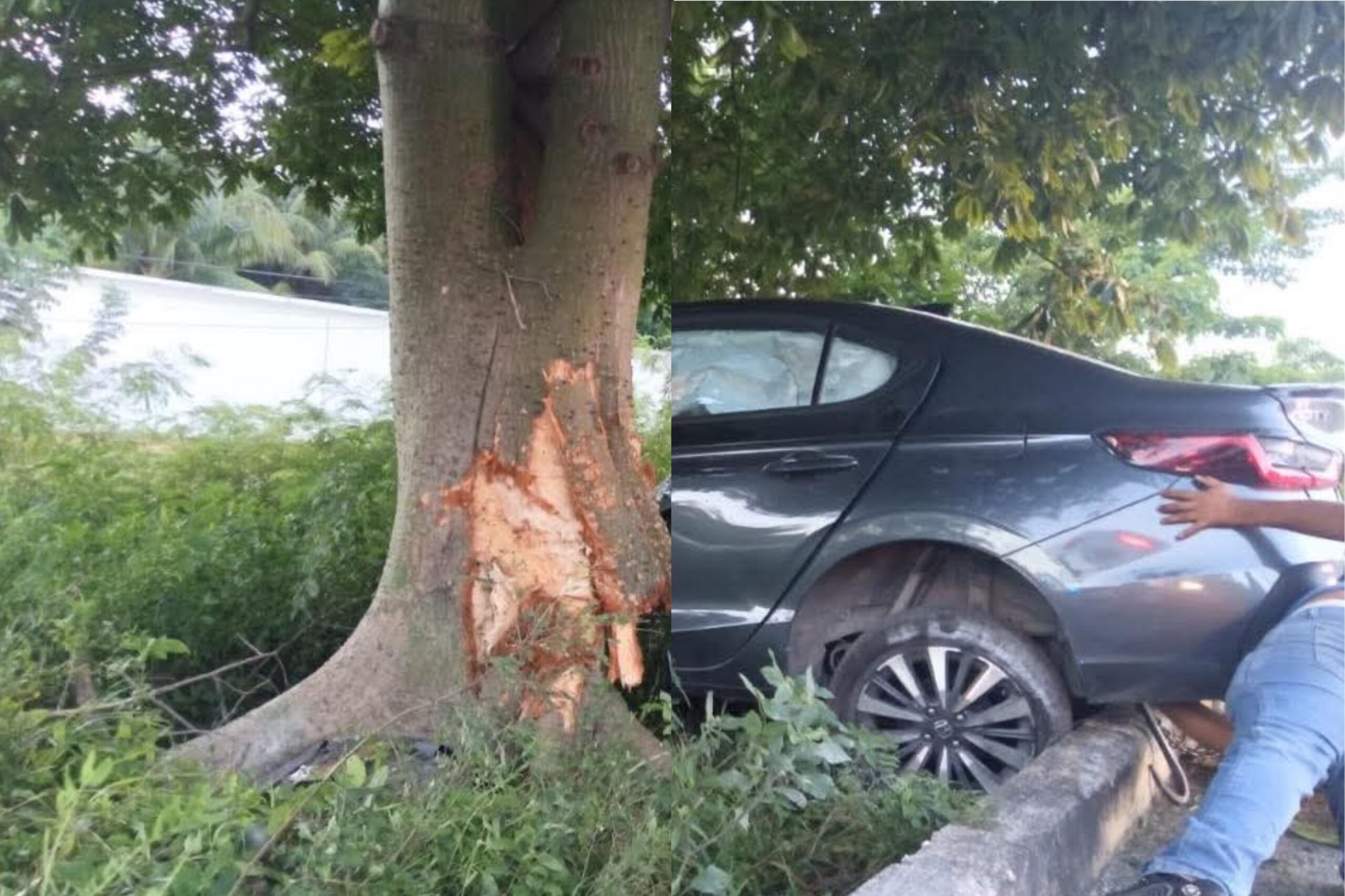 De acuerdo con los primeros reportes, el conductor circulaba en sentido sur a norte cuando banqueteó y subió al camellón central que divide los carriles. Debido a la velocidad a la que se desplazaba, el vehículo terminó impactándose de frente contra un árbol de mediana altura, dejando graves daños en la parte frontal.