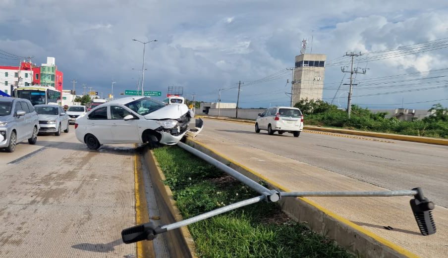 El automovilista perdió el control de su vehículo debido a las lluvias y provocó el derribo de un poste en el camellón central, en el Boulevard Colosio de Cancún.