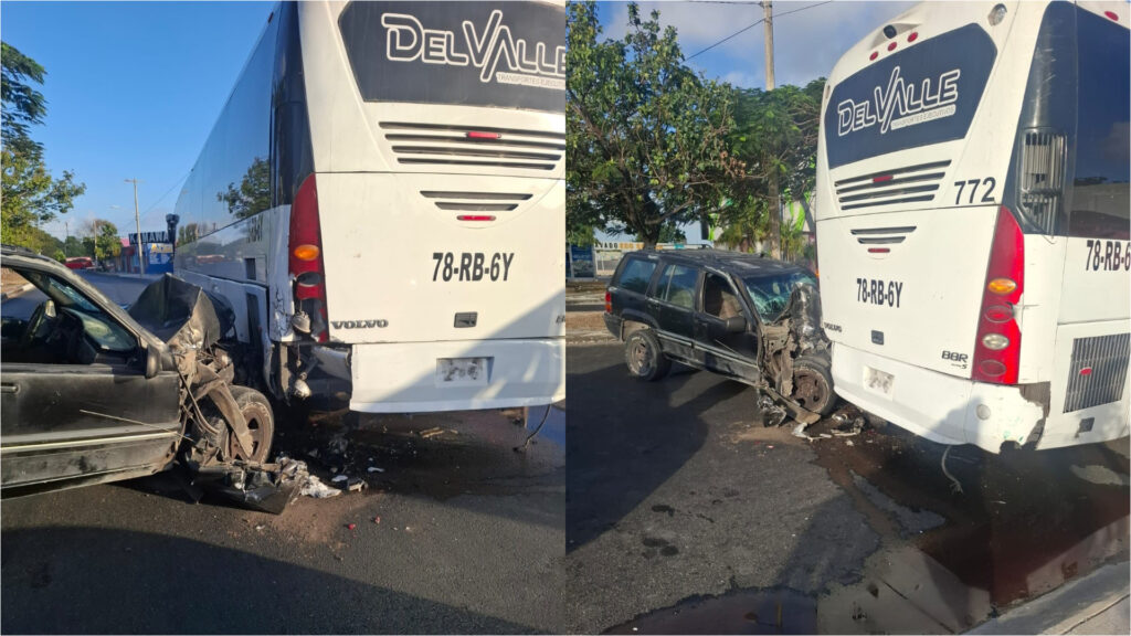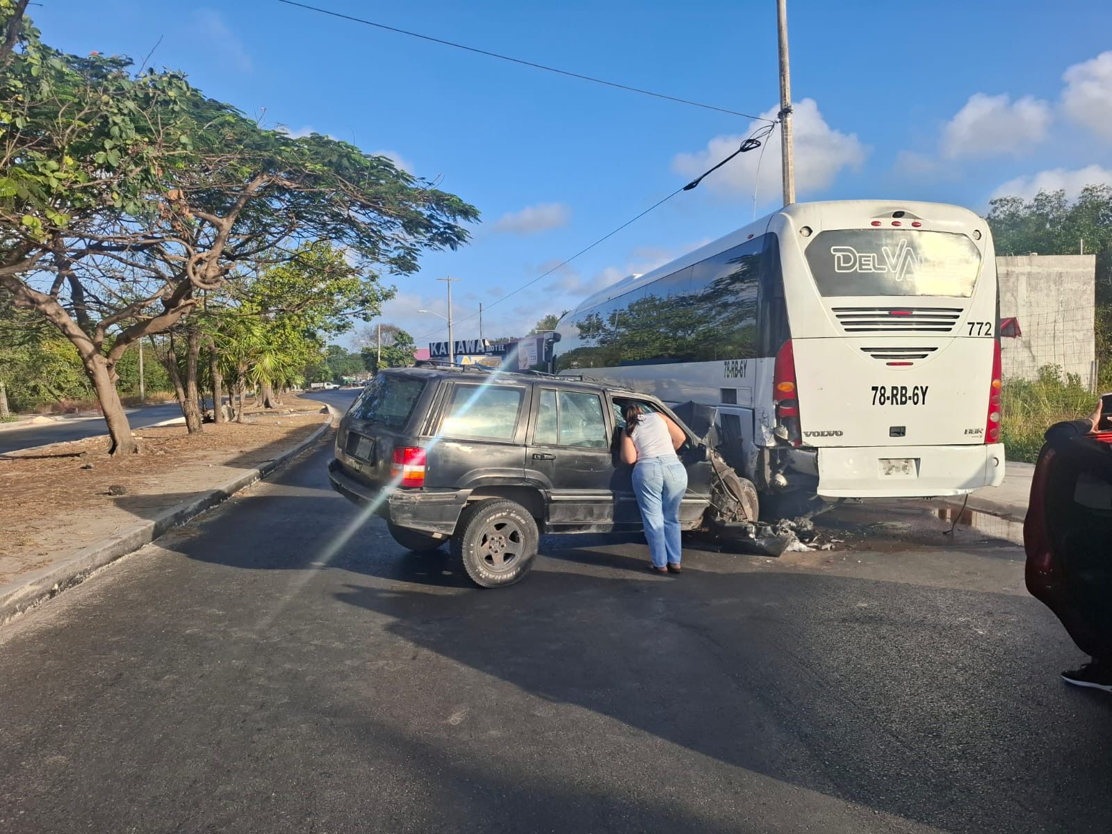Cancún (Marcrix Noticias).– Un accidente de tránsito se registró la mañana de este domingo en la Supermanzana 226 de Cancún, luego de que el conductor de una camioneta Jeep perdiera el control y se impactara contra un autobús de la empresa Del Valle que se encontraba detenido momentáneamente.