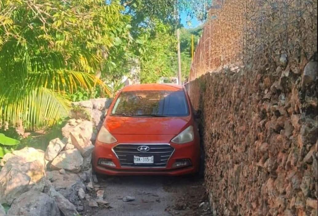 El incidente ocurrió en una vialidad ubicada a un costado del campo de béisbol, conocida entre los habitantes por ser utilizada únicamente por peatones, ciclistas y motociclistas. Aún así, el conductor decidió avanzar, pero el espacio no fue suficiente y el vehículo quedó prensado entre dos albarradas.