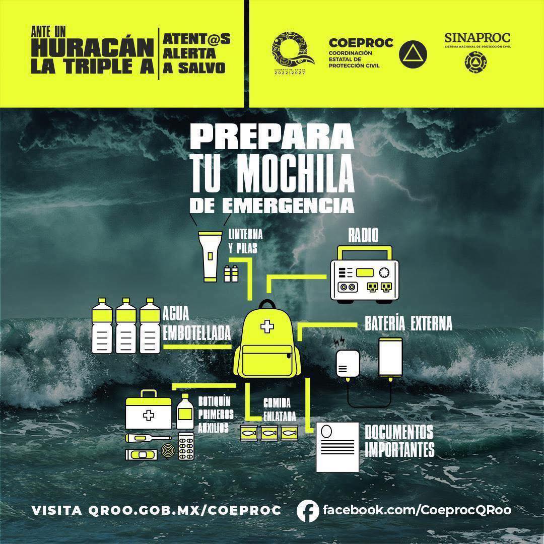 Cancún (Marcrix Noticias)-Ante la posible formación de un ciclón tropical en el Caribe, las autoridades de Protección Civil de Quintana Roo exhortaron a la ciudadanía a preparar su mochila de emergencia y mantenerse informada por canales oficiales durante la actual temporada de lluvias y huracanes.