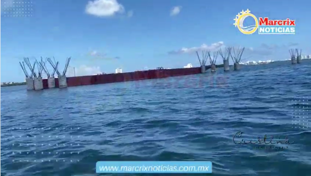 Una embarcación adscrita a Asociados Náuticos de Quintana Roo partió desde Punta Norte hasta llegar al sitio en donde Marcrix Noticias pudo constatar la instalación de las columnas, formadas en grupos de cuatro, visibles gracias a que las varillas y el cuerpo de cemento que las envuelven sobresalen unos cuantos metros por arriba del nivel de la laguna.