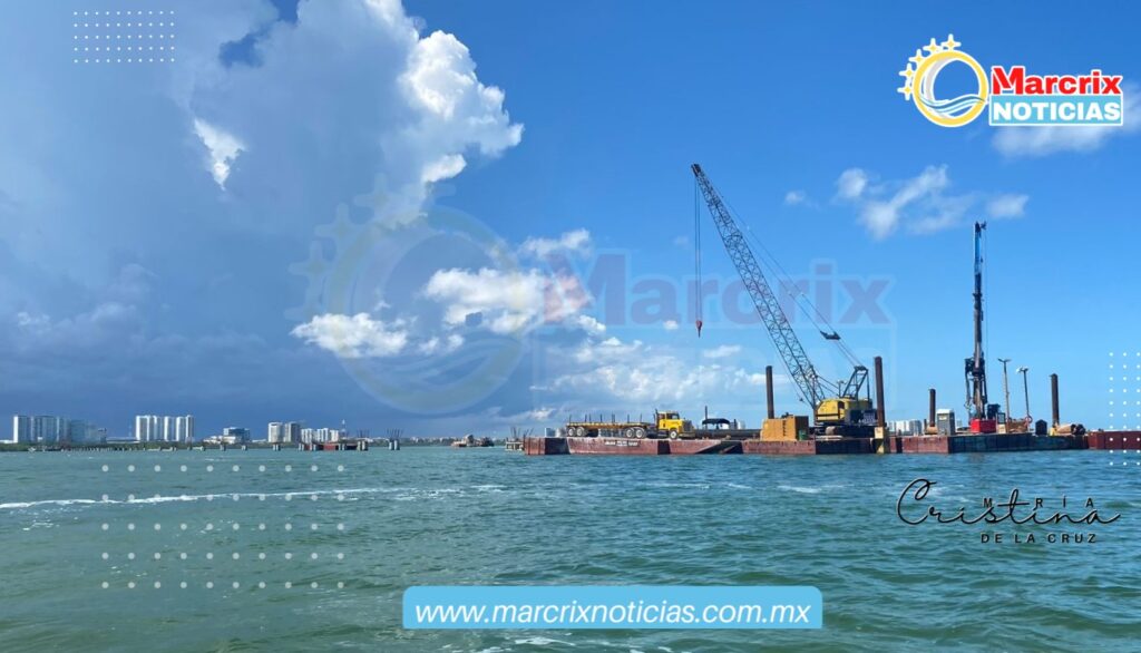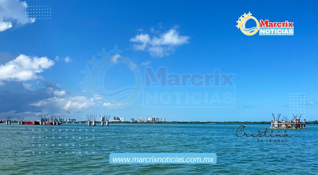 Cancún (Marcrix Noticias).— Una serie de columnas en la Laguna Nichupté podían observarse este jueves 21 de septiembre como parte del proyecto del Puente Vehicular, el cual se construye en esta zona emblemática de la zona turística de Cancún y que se planea inaugurar en siete meses.