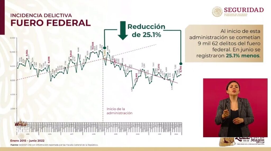 En conferencia mañanera, encabezada por el presidente Andrés Manuel López Obrador (AMLO) desde Palacio Nacional, Rosa Icela Rodríguez indicó que en junio de 2022 el homicidio doloso registró una disminución de 13.4% en comparación con su máximo histórico desde 2018.