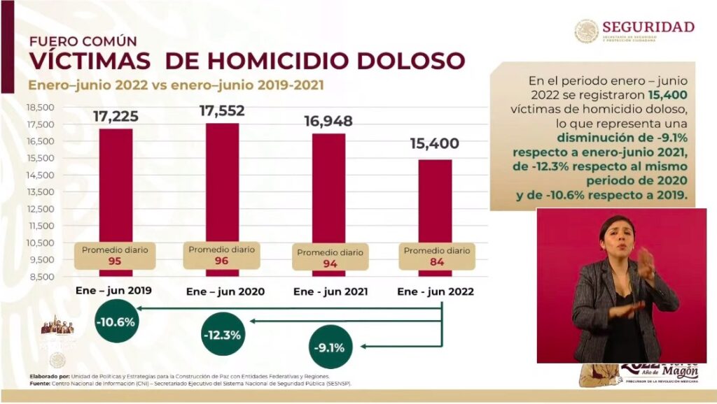 Indicó que en el periodo de enero a junio de 2022 se registraron 15,400 víctimas de homicidio doloso, lo que representa una disminución del 9.1% respecto al mismo periodo del año 2021.