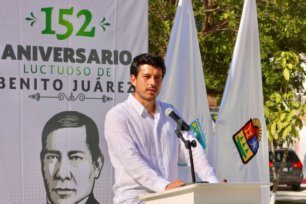 Puerto Morelos, Quintana Roo, (MARCRIX Noticias), 18 de julio de 2024.- Hoy, más que nunca, los ideales de Benito Juárez son relevantes. Debemos recordar su ejemplo y trabajar juntos para construir una sociedad más justa y equitativa, señaló el Oficial Mayor, Rodrigo Ruiz Álvarez, al encabezar la ceremonia cívica con motivo del 152 aniversario luctuoso del “Benemérito de las Américas”.
