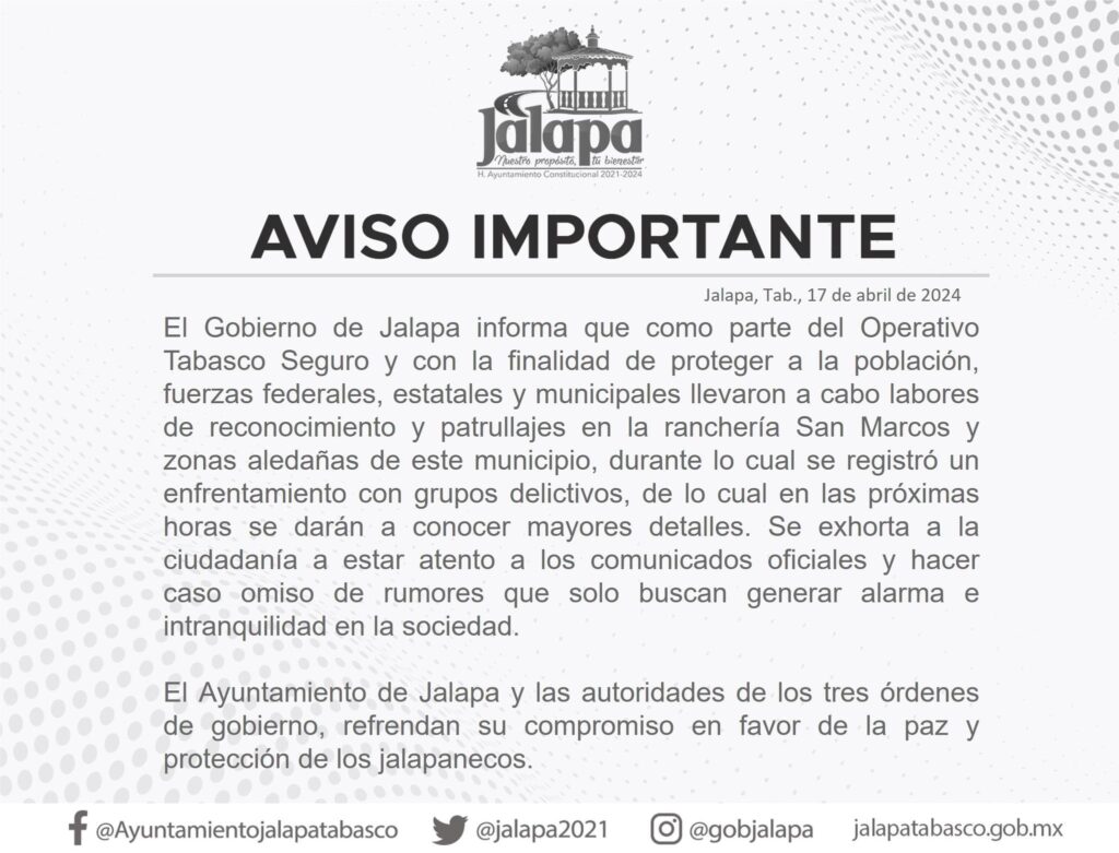 Gobierno Municipal de Jalapa, Tabasco confirmó el enfrentamiento y operativo