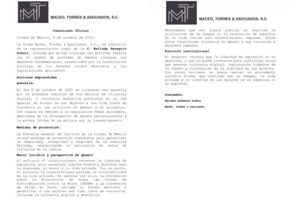 “Se interpuso una querella por la probable comisión de los delitos de violencia digital y violencia mediática derivados de la divulgación de hechos pertenecientes a la esfera íntima de la artista sin su consentimiento”, precisó el comunicado oficial del bufete jurídico.