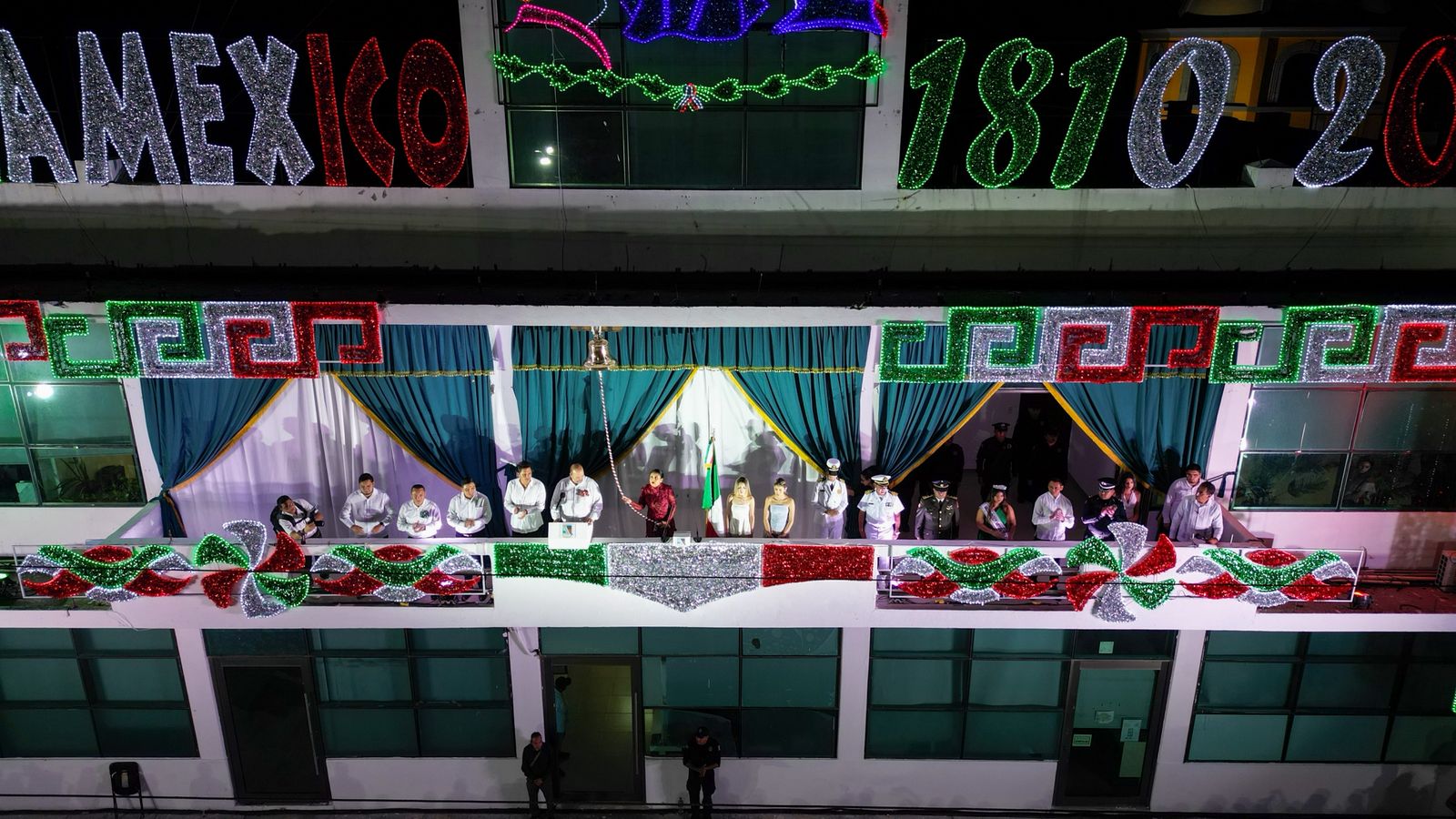 Entre luces de nuestra insignia nacional y grandes adornos que embellecieron el recinto Blanca Merari tocó la campana y ondeó la bandera desde el balcón del Palacio Municipal como lo hiciera hace 215 años el cura Miguel Hidalgo y Costilla en 1810 en Dolores Hidalgo, Guanajuato.