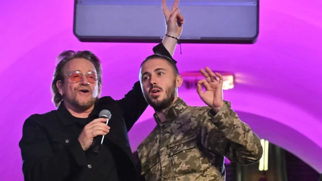 Ucrania (Marcrix Noticias).- El cantante irlandés, Bono, líder de la banda U2, brindó un concierto espontáneo desde una estación del metro de Kiev, como aportación personal a la paz y coincidiendo con el llamado Día de la Victoria sobre la Alemania nazi y el fin de la II Guerra Mundial en Europa.