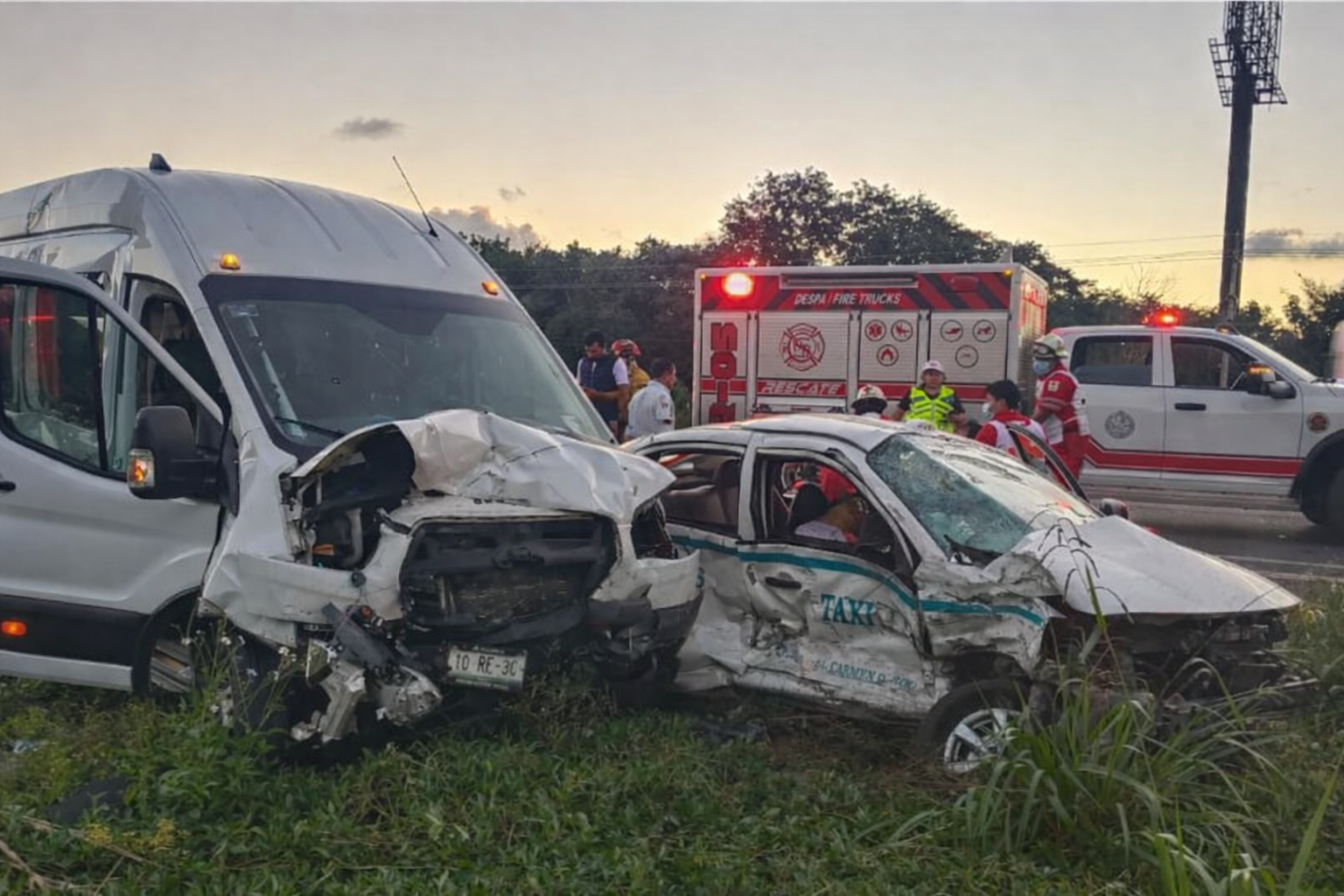 Un taxi y una van turística colisionaron de frente en la Playa del Carmen – Cancún; el accidente provocó cierre parcial de la vía.
