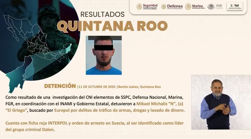 Ciudad de México (Marcrix Noticias).- En la conferencia de prensa La Mañanera de este 11 de noviembre, que encabezó la presidenta Claudia Sheinbaum Pardo, el secretario de Seguridad y Protección Ciudadana, Omar García Harfuch, informó que se logró la detención en Cancún del narcotraficante europeo, Mikael Michalis “N” alias “El Griego”.