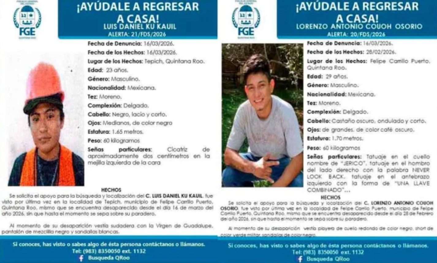 Lorenzo Antonio Couoh Osorio y Luis Daniel Ku Kauil, fueron reportados como desaparecidos y la Fiscalía activó las fichas de búsqueda.