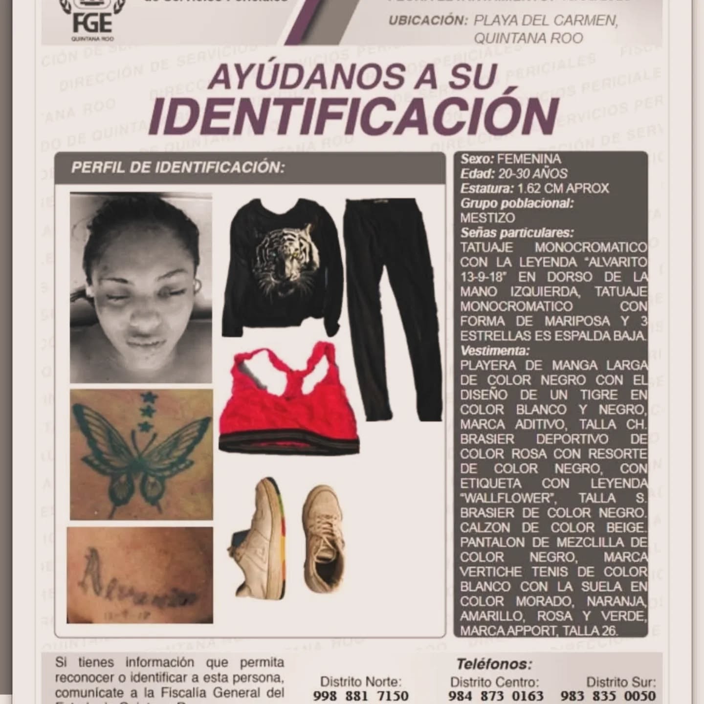 De acuerdo con información difundida por la Fiscalía General del Estado de Quintana Roo, la mujer no ha podido ser identificada, por lo que se pide la colaboración de la población para aportar cualquier dato que pueda ayudar a conocer su identidad y localizar a sus familiares.