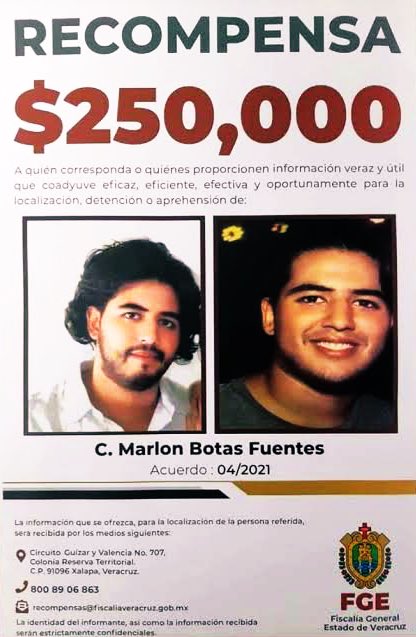 Marlon Botas escapó tras la muerte de Bendimes y la Fiscalía estatal ofreció 250 mil pesos para quien diera información sobre su paradero.