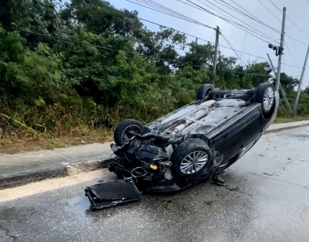 El automóvil quedó totalmente volcado sobre la vía lateral de esta carretera Playa del Carmen a Tulum.