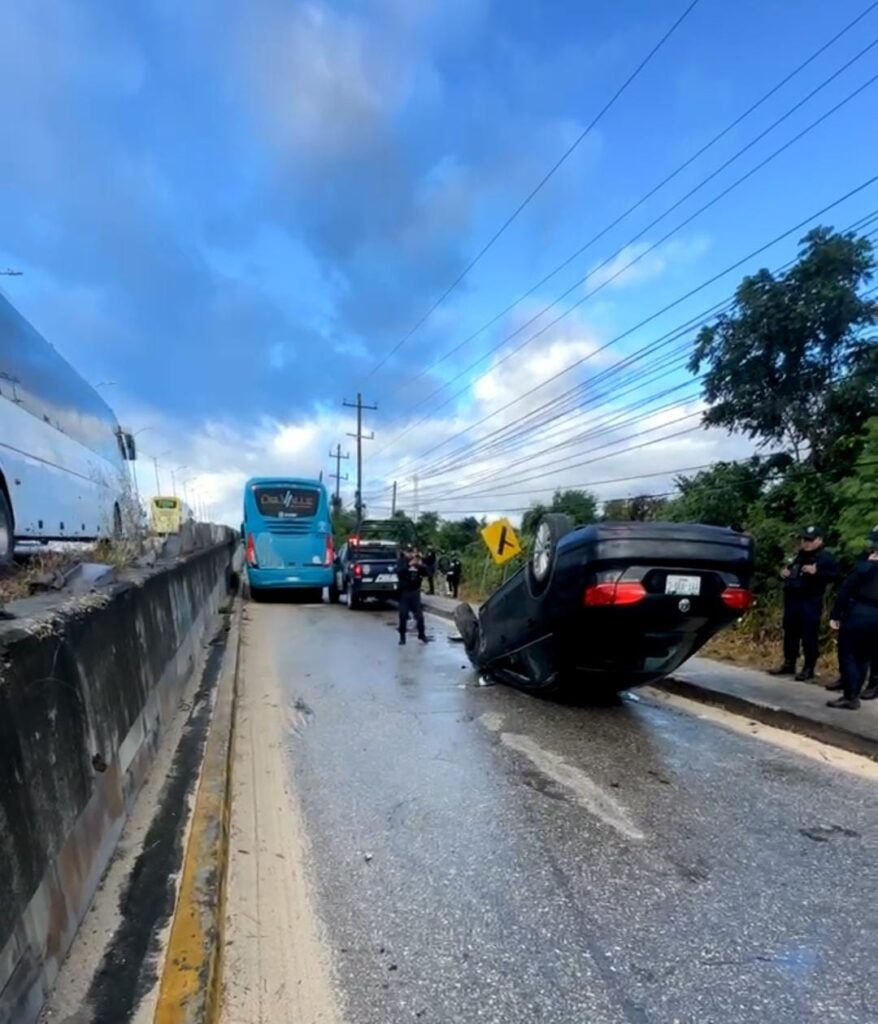 El automóvil quedó totalmente volcado sobre la vía lateral de esta carretera Playa del Carmen a Tulum.